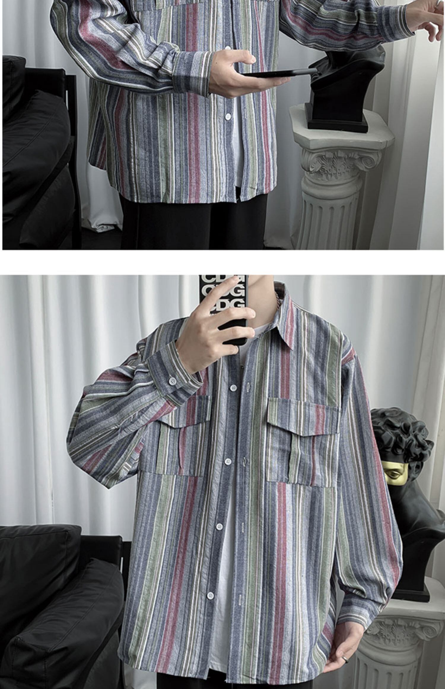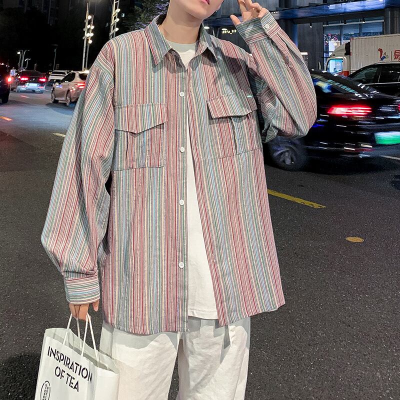 スタンダードストライプシャツ ルーズカジュアルジャケット ロング レトロ 7/14 mi2051743833279