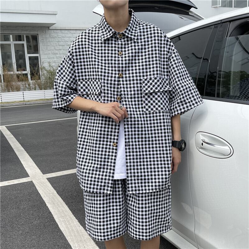 サマー格子柄ルーズカジュアルシャツ ショーツ 夏物 ブルマー 7/14 mi2098291516179