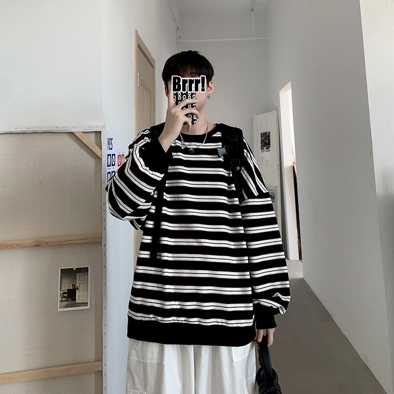 ストライプセーター ラウンドネックスプリングオータムTシャツ トップス ロング 春物 秋物 Oネック 7/14 mi2046045788541