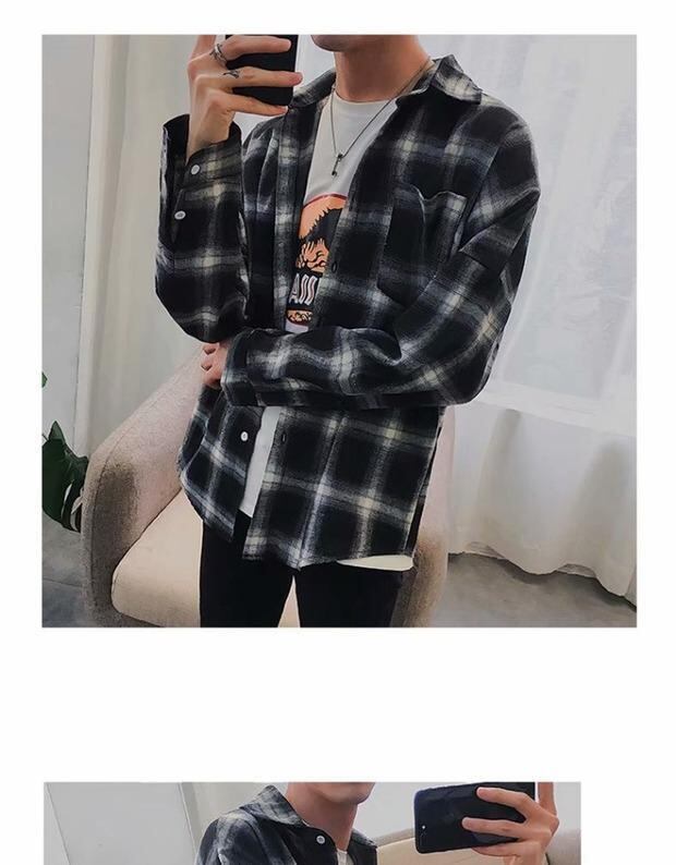 ブラックホワイト格子柄シャツ ルーズスプリングジャケット ロング 春物 7/14 mi2026653525620