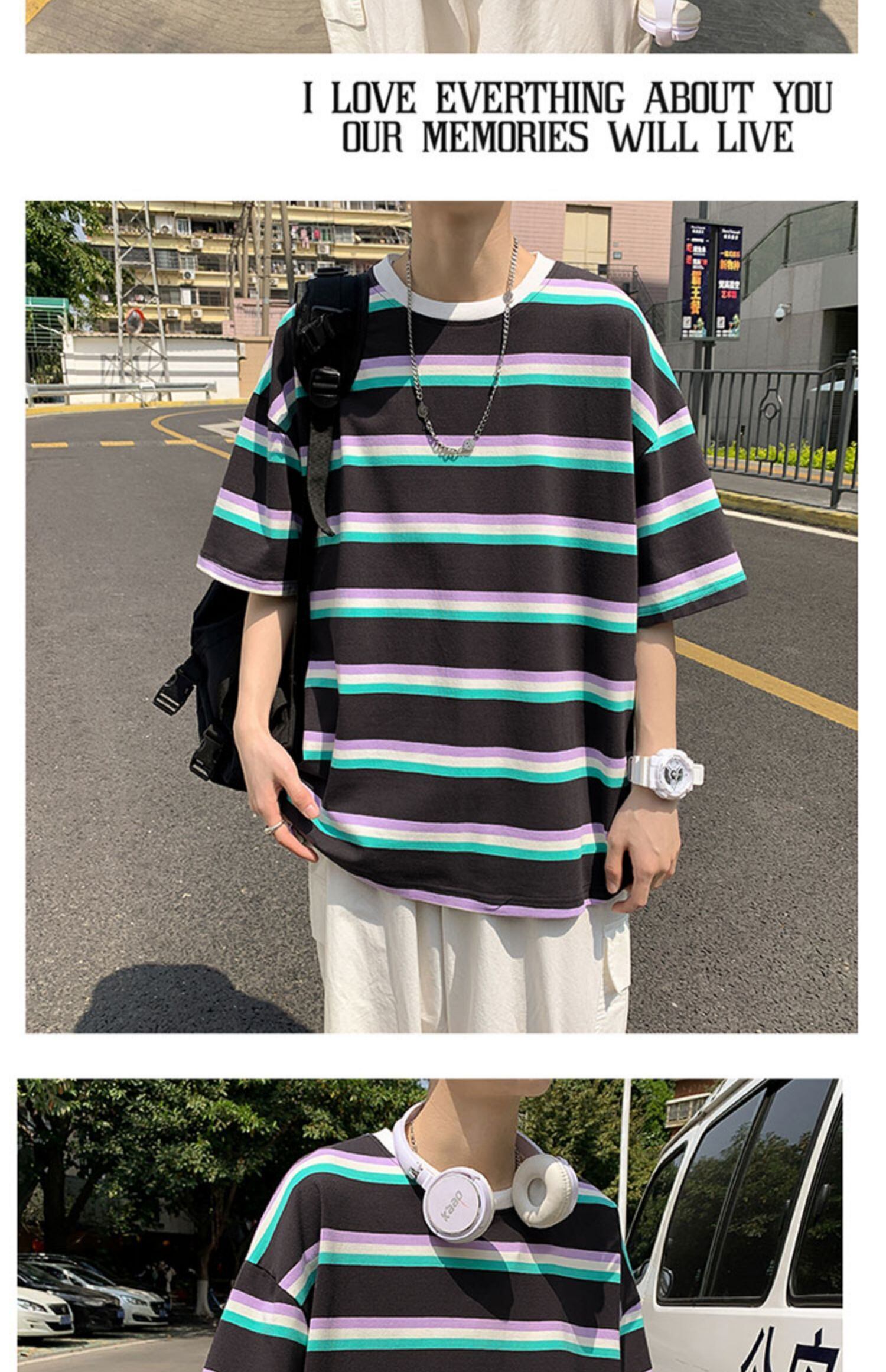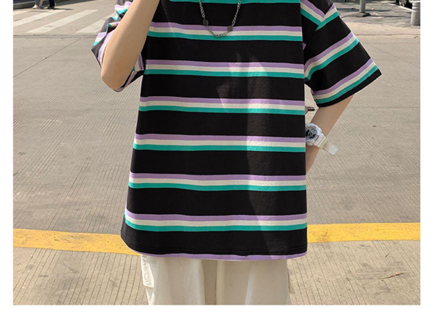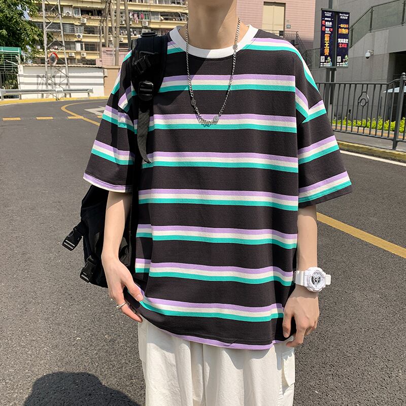 スタイルストライプTシャツ ラウンドネックルーズレッド かわいい Oネック 7/14 mi2071946608242