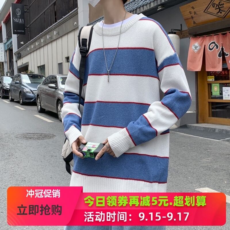ブルーホワイトストライプカラーラウンドネックセーター ルーズニットトップス カジュアルシャツ Oネック 7/14 mi2051397625810