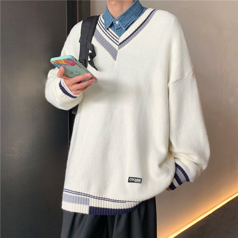 オータムウィンターカラーVネックセーター ルーズカジュアルホワイト かわいい 秋物 冬物 7/14 mi2060478703919