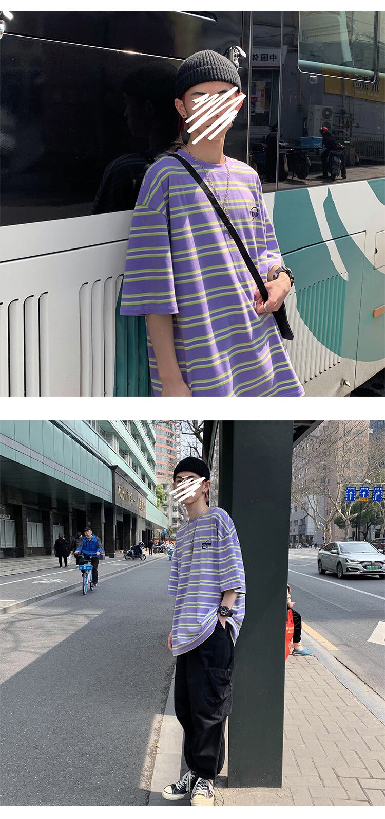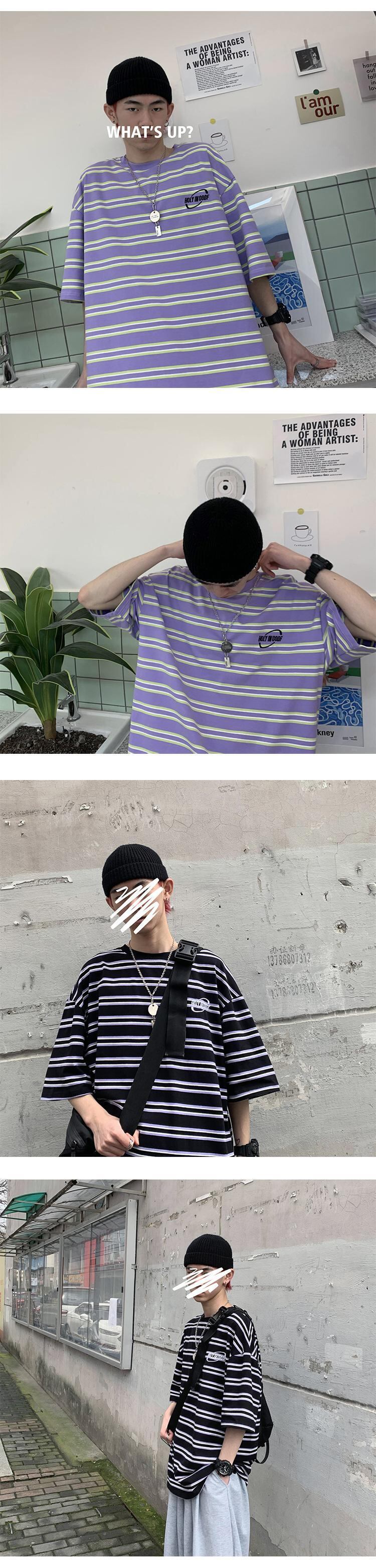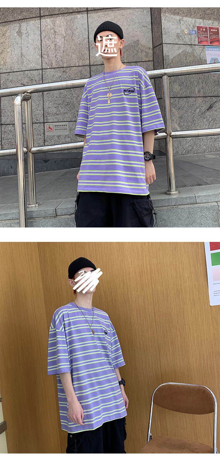 ストライプルーズラウンドネックスリーブTシャツ サマートップス 夏物 Oネック 2/13 mi2094992329418